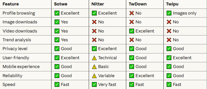 My verdict: For most users wanting all-in-one functionality, Sotwe remains the best choice. For specific needs, consider the alternatives above.